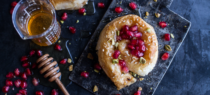 - Οταν έχουν πάρει ένα ωραίο χρυσαφένιο χρώμα (όχι ξεροψημένο!) τα βγάζουμε από τον φούρνο και τα στρώνουμε ζεστά στην πιατέλα. Ραντίζουμε επί τόπου με λίγο μέλι (περίπου 1/2 κουταλιά του γλυκού στο καθένα), και πασπαλίζουμε με το ρόδι και τα χοντροσπασμένα φιστίκια Αιγήνης.